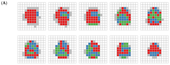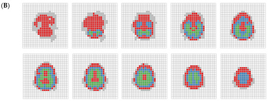 Figure 5 illustrates the spatial distribution of clusters for both large unit size (Figure 5A) and the small unit size (Figure 5B) across 10 x-y slices. Each slice contains 12 × 12 cubes for the large unit and 24 × 24 cubes for the small unit along the z-axis. These slices span from the brain’s base (slice 1) to the top (slice 10). In both Figure 5A (large unit) and Figure 5B (small unit), cluster C1 (red), identified by RDMDP, consistently dominates lower parts of the brain, and also appears in some boundary regions, particularly toward the upper part. In Figure 5A, clusters C2 (blue) and C3 (green) are mostly spread across the middle and upper parts of the brain without distinctive patterns. In Figure 5B, cluster C2 is adjacent to cluster C1, whereas cluster C3 occupies the more central regions of the brain. This suggests that the brain’s core regions may be less associated with age group differences, as indicated in Table 1.