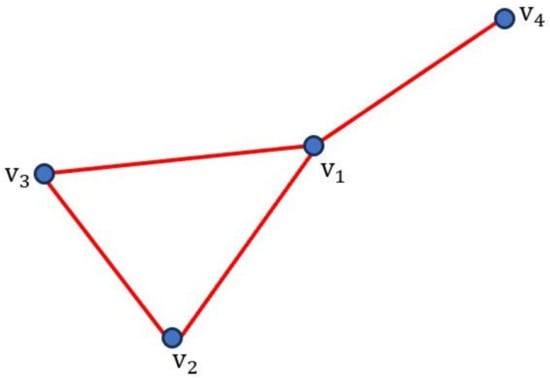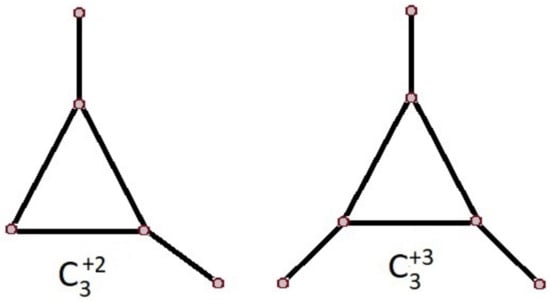 Graph is defined as the path of order t. For , we can depict by introducing an additional edge connecting one end of the path to the vertex located at a distance of 2 from that end. This newly added edge forms a triangle within the graph. Notably, when , is equivalent to , which represents a complete graph consisting of three vertices.