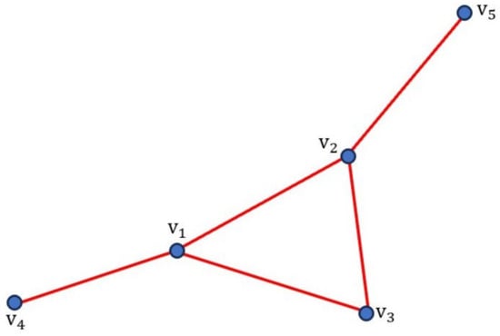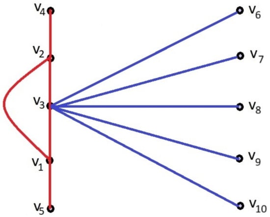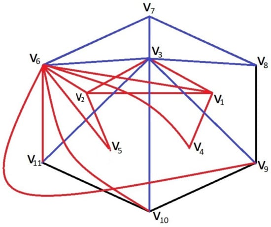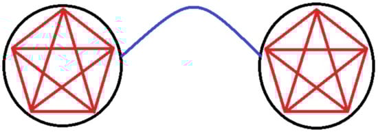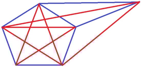 Our goal is to show that every 2-coloring of the complete graph on eleven vertices () must contain either a blue or a red , thereby establishing an upper bound. According to Theorem 6, any 2-coloring of must include a monochromatic . Let us consider a graph F isomorphic to . Without loss of generality, let the vertices of F be . As illustrated in Figure 5, vertices and form a red .