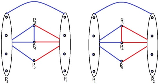 Consequently, based on the aforementioned Claims 2 and 3, we can establish that the sole admissible critical coloring of for the graph consists of two red subgraphs, interconnected exclusively by blue edges. A visual representation of this coloring scheme can be observed in Figure 8.