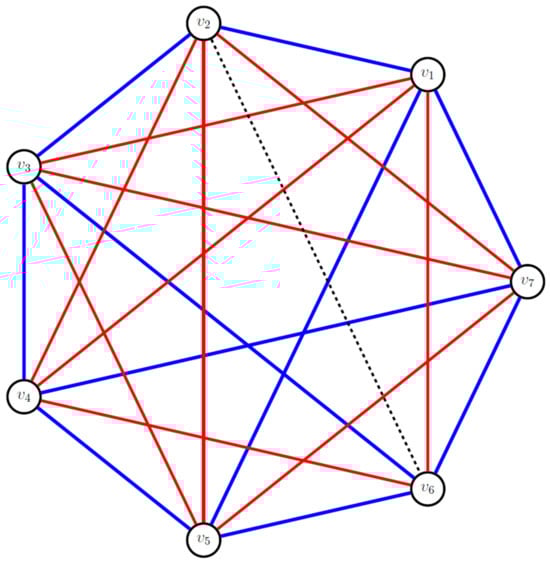 Let us assume that there exists a blue in the induced subgraph of vertices , say , as shown in Figure 6. If any edge connecting either or to vertices is blue, then a blue must exist. Therefore, we can conclude that all edges from to must be red, and in this case, we obtain a red , as shown in Figure 6.