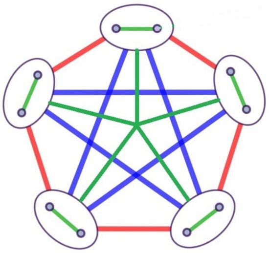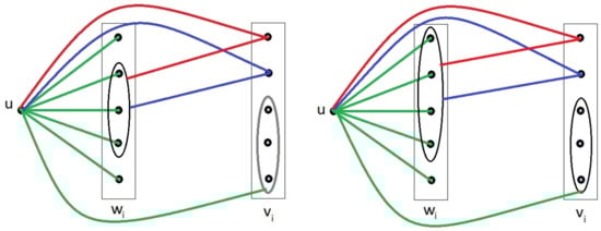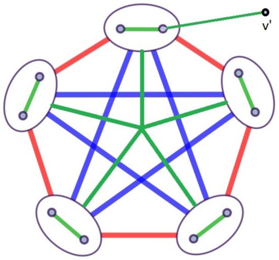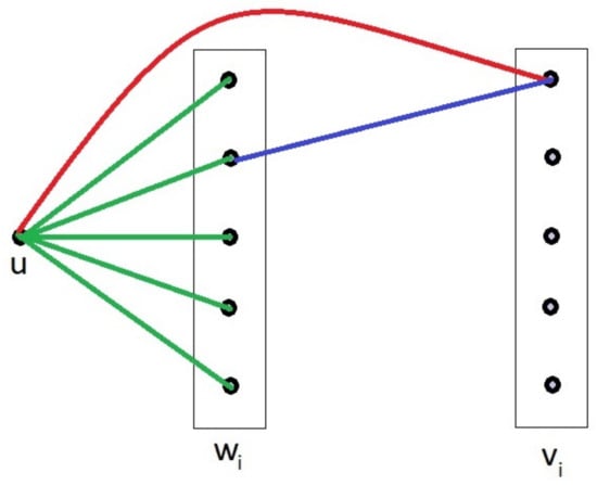 Now, we prove that every vertex of a graph - u is associated with exactly one green edge. Let us suppose that has no green edge; then, there exists an either red or blue with center . By the same logic as ‘u’, is also connected to each vertex of by red–blue edges. But this is a contradiction, as has at least one green edge and is arbitrary, so each vertex has at least one green edge.