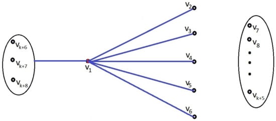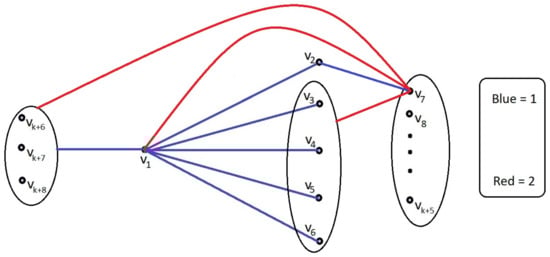 Because , we have . Therefore, by using Theorem 4, we can conclude that any k coloring of will contain a monochromatic . For the sake of clarity, we shall label the k colors as the numbers 1, 2, 3, …, up to k, while the vertices shall be denoted by . Without loss of generality, let us assume that vertices form a monochromatic with as the center, in color 1 (blue). To prevent the formation of a monochromatic subgraph, we enforce the rule that for each , there can be at most one edge utilizing color 1 in the set of edges . □