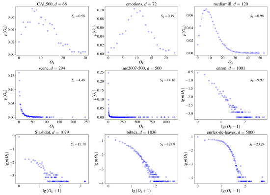 Empirical distributions of and the k-occurrence skewness (for the datasets Slashdot, bibtex, and eurlex-dc-leaves, and are computed based on the dimensionality-reduced feature space), where , of nine MLDs with different dimensionalities.