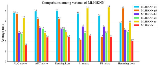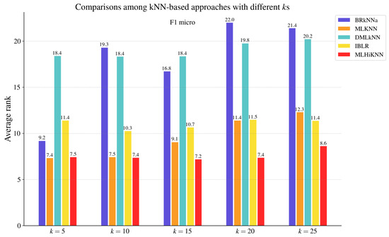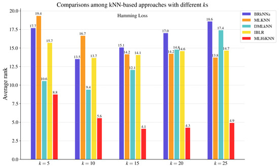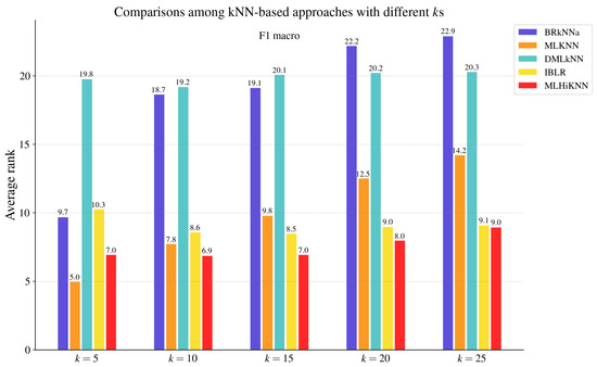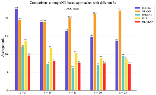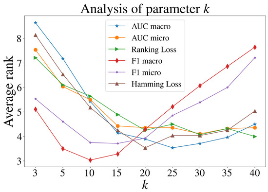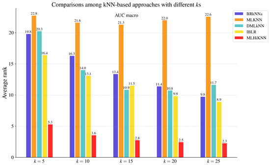 To validate the effectiveness of the proposed method, we experimentally compared MLHiKNN with some well-established approaches, including nine MLC algorithms and three hubness reduction techniques. The compared MLC algorithms include BR [14], CC [17], ECC [17], RAkEL [18], RAkELd [18], BRkNNa [5], MLKNN [6], DMLkNN [7], and IBLR [8]. We employed the implementations in the Scikit-multilearn [67] library for BRkNNa and MLKNN and the implementations in the MULAN [63] library for the other seven approaches. For BR, CC, ECC, RAkEL, and RAkELd, we used C4.5 as the base classifier and employed its implementation J48 on the WEKA [68] platform. For ECC, we followed the default parameter settings. Specifically, ECC employed sampling with replacement to create the data for each base model in the ensemble. Each model was trained on 100% of the instances. The number of models was set to 10. For RAkEL and RAkELd, the size of the label subsets was set to 3. The number of models was determined adaptively based on the number of labels and the subset size, following the default settings. For the kNN-based methods, BRkNNa, MLKNN, DMLkNN, IBLR, and MLHiKNN, the number of nearest neighbors to take into account, k, was set to 20 based on both the prior literature and empirical results. Previous studies typically adopted k values ranging from 8 to 12 for MLKNN, from 8 to 10 for DMLkNN, and from 1 to 30 for BRkNNa, and used for IBLR. In our experiments, we further evaluated each method with and observed that the optimal performance tended to occur when k was between 15 and 25 for BRkNNa, DMLkNN, and IBLR, and between 5 and 20 for MLKNN, in terms of AUC macro. To ensure a fair and consistent comparison across methods, we fixed for all methods and also report comparison results for these kNN-based methods under each k value in Figure 2, Figure 3, Figure 4, Figure 5, Figure 6 and Figure 7. The smooth parameter was set to 1.0 for MLKNN and DMLkNN. Other parameters followed the default parameter settings. For the proposed approach, MLHiKNN, and were set to 3 and 2, respectively.