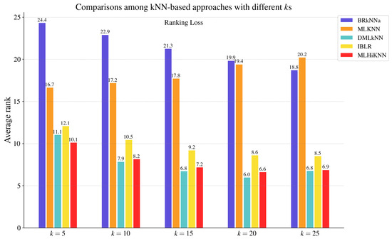 The average rank across all the datasets of each combination of algorithm and k out of twenty-five combinations in terms of Ranking Loss.