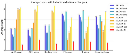 This equation represents the fraction of data points not selected as one of the k nearest neighbors by any other sample. In Table 1, the hubness measures were computed with . Meanwhile, an example was identified as a hub if its k-occurrence was larger than and an antihub if its k-occurrence was zero. To reduce the influence of extremely infrequent labels, those with fewer than 20 instances were removed from each dataset. Similar label-frequency thresholds have been adopted in previous work to mitigate the impact of rare labels [65,66]. The chi-squared test was used to reduce the dimensionality of feature space for text datasets. In each experiment, 2-fold cross-validation was performed five times. Specifically, each dataset was randomly split into two equal-sized parts, with each part used once as the training set and once as the testing set. This 2-fold cross-validation procedure was repeated five times with different random splits. The average results are reported.