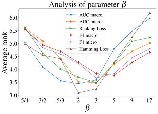 As increases, it becomes possible to estimate the query label based on the labels of other instances for which x is in the k-neighborhoods. Thus, the weight assigned to x’s own label set should gradually decrease. The hubness information contributes more to the fuzzy membership . We define a threshold , where is a preset parameter, such that when , the contribution of x’s own label set is reduced to zero, i.e., . At this point, we consider that the hubness information provides significantly more informative value than the labels of x. The threshold is proportional to k since a larger k usually leads to a larger for each instance. The parameter determines how the threshold changes with respect to k. The use of is also motivated by the observation in previous research that an example is typically identified as a hub if its k-occurrence is larger than . In such cases, a point’s frequent appearance in k-neighborhoods is often caused by the hubness phenomenon rather than label similarity, making its label less reliable for prediction. Empirically, we found that setting yields good average performance, in line with the threshold commonly adopted in the literature for hub definition. A detailed parameter analysis is provided in Section 4.5.