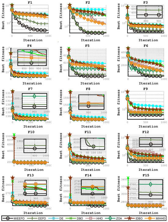MIEEFO was compared with the following seven advanced meta-heuristic methods: EEFO, DE, DBO [46], HHO, ZOA [47], IDBO [48], and MIHHO [49]. To ensure a fair comparison, the population size for each algorithm was set to 30 individuals, with 30 runs and 1000 iterations for each run. The default parameters for using the metaheuristic are listed in Table 2. The experimental platform was set up on a computer with an Intel(R) Core(TM) i7-8750H CPU, 2.2 GHz clock speed and 16 GB of RAM, running the Windows 10 (64-bit) operating system, with Matalab2022b as the software.