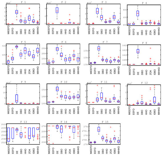 In this subsection, box plots are used to compare MIEEFO with the other algorithms. The upper and lower bounds of the box plots represent the maximum and minimum data values, respectively. The upper quartile corresponds to the 75th percentile of the ordered data, whereas the lower quartile corresponds to the 25th percentile. The median represents the 50th percentile of ordered values. Box plots allow us to visualize outliers, the spread of the distribution, and the symmetry of the data. As shown in Figure 5, it is evident that MIEEFO exhibits very narrow boxes, consistently maintaining the lowest points across most test functions. Compared to algorithms such as EEFO, MIEEFO achieves lower values in the box plots, while demonstrating better optimization performance than DE, DBO, and ZOA. Overall, MIEEFO demonstrates strong optimization capabilities.