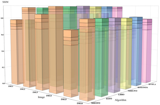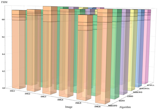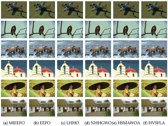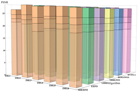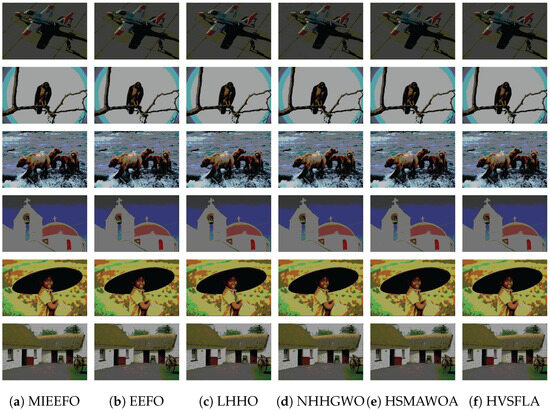 This article compares Kapur entropy multithreshold image segmentation algorithms based on EEFO, LHHO, NHHGWO, HSMAWOA, and HVSFLA. Meanwhile, Figure 7, Figure 8 and Figure 9 present bar charts of PSNR, SSIM and FSIM results across multiple thresholds, providing a clearer display of the evaluation results. Figure 10 and Figure 11 show the segmentation results of different algorithms with thresholds of 4 and 12. From Figure 10 and Figure 11, it can be seen that as the threshold increases, the images become clearer, indicating that a higher threshold can effectively capture more information. Table 5, Table 6 and Table 7 provide the numerical evaluation results for the PSNR, SSIM and FSIM in the image segmentation task. The data show that MIEEFO generally outperforms other algorithms. Additionally, as the threshold gradually increased, the PSNR, FSIM and SSIM values of the segmented images also increased. Experimental results demonstrate that MIEEFO has a significant advantage in experiments based on Kapur entropy threshold segmentation.
