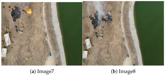 In forest ecosystems, wildfires are characterized by their sudden onset and uncontrollabled nature. Once they exceed human control, they can cause severe damage to human lives and property, as well as significant harm to the ecological environment, and ultimately evolve into forest fires. An image-segmentation-based forest fire detection technique was proposed to minimize the damage caused by forest fires. The goal of forest fire image segmentation is to separate the fire-affected areas from the forest images for subsequent fire identification [53]. To verify the effectiveness of this algorithm in practical engineering applications, MIEEFO is used to segment forest fire images. Images captured using digital cameras were used as experimental samples. Figure 12 shows two forest fire images. All algorithms were tested under the same experimental conditions to ensure objectivity and fairness of the experiment. The algorithm parameters were set as described in the previous section. To verify the effectiveness of the algorithm in different dimensions, the number of thresholds used in the experiment was set to 2, 4, 8, 10 and 12. The image segmentation results of the multilevel thresholding algorithm based on MIEEFO for the different dimensions are shown in Figure 13. There is no obvious contrast or distinction between the fire-affected areas and background, which limits the optimization ability of the algorithm.