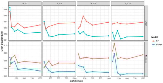 In contrast, RGALF’s superiority is most pronounced in nonlinear settings, where it achieves 25–69% lower variance across all  (e.g., , : variance 0.025 vs. RF’s 0.076) and 19% lower average bias. The widening MSE gaps as  (e.g., , : MSE 0.032 vs. RF’s 0.054) confirm RGALF’s ability to approximate smooth nonlinear surfaces more effectively than RF’s piecewise constants. This is consistent with theoretical results, which predict that RGALF achieves Stone’s optimal rates for additive models () under appropriate node size and sample size conditions. Node size critically mediates performance: small nodes (2–5) optimize RGALF for a fine-grained structure in linear patterns, while moderate nodes (5–10) balance bias and variance in nonlinear settings. Notably, RGALF requires a critical sample size () to activate its advantages, as small samples () suffer from over-regularization (e.g., nonlinear : MSE 0.059 vs. RF’s 0.086). These results underscore RGALF as a specialized tool for nonlinear inference, achieving superior consistency ( MSE decay) compared with RF’s slower convergence ().