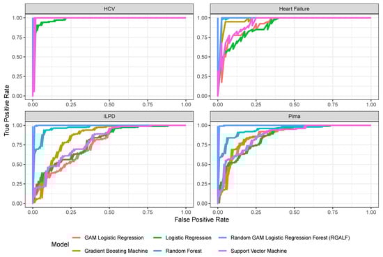 Receiver Operating Characteristic (ROC) curves of the various methods across medical datasets (Pima Diabetes, Heart Failure, Hepatitis C [HCV], and Indian Liver Patient [ILPD]).