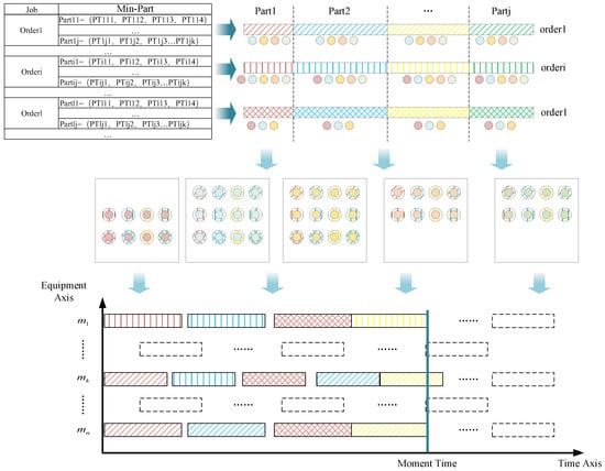 As shown in Figure 2, the Part set and process constraints are first given. On this basis, a large number of scheduling combinations can be realized. If there are more Parts, the scheduling scheme should be constructed by simultaneously considering the order situation, equipment situation, process constraints, and order delivery time and model requirements. In the proposed approach, the scheduling scheme for a single device is to add the selected Part to the Gantt chart one by one, as shown in Figure 2. After selecting a Part, the process and scheduling scheme for a single device for all orders is formed.