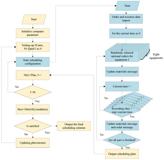 In the realm of meta-heuristic algorithms, we opt to utilize the ant colony optimization (ACO) algorithm. ACO is inherently well-suited for combinatorial optimization problems in discrete scheduling without the need for extensive modifications. Moreover, its pheromone mechanism efficiently inherits high-quality solutions from the mathematical programming phase, thereby expediting convergence. Additionally, the pheromone evaporation and update mechanisms support real-time adjustments, making it suitable for dynamic production environments and enabling more efficient responses to changes in production orders. Consequently, ACO strikes a balance between solution quality, computational costs, and robustness, outperforming algorithms such as particle swarm optimization (PSO) and genetic algorithms (GAs) in this context. While other algorithms like PSO excel in continuous optimization problems, in scenarios requiring strong discreteness, multiple constraints, and structured solutions like production scheduling, the comprehensive advantages of ACO are more pronounced.