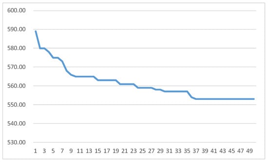 First, the order information was converted into an order matrix and stored as a file for reading. After that, the parameters of the ant colony were set; in this validation, the number of ants was set to 50, the number of cycles was set to 150, the pheromone coefficient was set to 10, the distance influence coefficient was set to 1, the pheromone exponent parameter was set to 1, the distance influence exponent parameter was set to 1, and the pheromone volatilization coefficient was set to 0.5. Then, the editing of the scheduling scheme code was completed according to Figure 5 based on the information in Table 5, and was integrated into the iterative process of the ant colony. Finally, the results of the iterative process of the ant colony were transformed into a Gantt chart, outputting the total time spent in producing all orders with the scheduling scheme. Its convergence diagram is shown in Figure 6.