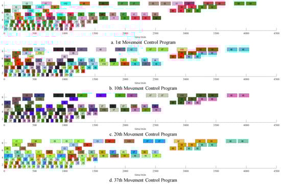 The results of the iterations are shown in Table 5. The first round (589 MPTCs) results in 2.8632 days, while the actual shop floor scheduling takes 3 days, which is a huge improvement over the direct manual scheduling results. With further iterations of optimization, in the fifth iteration, the resulting scheduling solution takes (575 MPTCs) 2.7951 days to complete the production, which is an improvement of 6.83% compared to the manual scheduling, and at this point, the optimization progress starts to slow down. In the 10th iteration, the scheduling plan is further optimized to require (565 MPTCs) 2.7465 days to complete the production of all orders, and finally, in the 37th iteration, the optimal solution under the algorithm is found, and the generated scheduling plan requires (553 MPTCs) 2.6882 days to complete the production of all tasks, which improves productivity by 10.04% compared to the original manual scheduling.