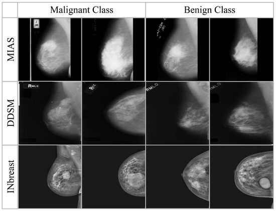 This research utilized mammogram images from three publicly available datasets: MIAS, DDSM, and INbreast. DDSM is a curated subgroup of regular DDSM (Digital Database for Screening Mammograms) and contains different breast imagery samples. The INbreast dataset blends several FFDMs (Full Field Digital Mammograms). The samples of the INbreast dataset provide more useful facts than the mammogram images of the DDSM database. The researchers also commonly use the MIAS dataset, which has 322 mammogram images of size. This dataset includes aberrant and normal photos. The two types of abnormal images are benign and malignant. This study utilized a total of 1572 original mammography images from three benchmark datasets: 300 photos from MIAS (39 malignant, 52 benign, 209 normal), 1194 images from DDSM (637 malignant, 557 benign), and 152 images from INbreast (70 malignant, 76 benign). The data were randomly and equitably divided into training and testing sets, maintaining class balance by stratified sampling. The utilization of these datasets shows that they are very famous in the breast cancer research community and considered standard for assessing models. Sample images from selected datasets for malignant and benign classes are shown in Figure 1, whereas the summary of each dataset is presented in Table 3.
