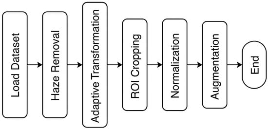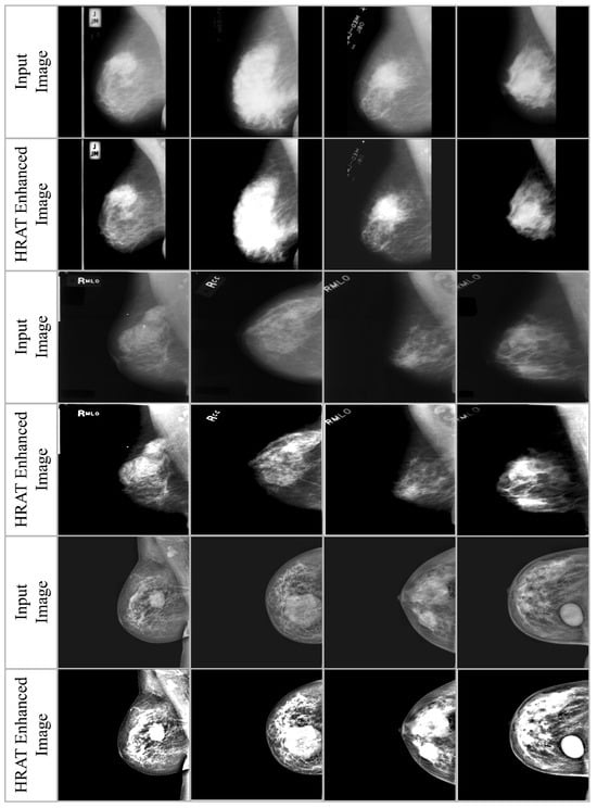 Here, is the enhanced value for location for channel i, and is the coefficient for controlling the effect of haze and adaptive transformation. and are the local mean and standard deviation of the region centered around a pixel, and is the global mean intensity of the image. In Step 5, the entire procedure is iteratively applied to all pixels and channels in the dataset to ensure consistent enhancement and haze removal, producing a refined mammography picture for further processing. The adj is essential for regulating the integration of the haze-removed image with the contrast-enhanced image. It functions as an adaptive weighting system that adjusts the influence of contrast enhancement according on local image attributes. In areas with low contrast or inadequate visibility, a greater adj value amplifies the contribution of the augmented image, thus enhancing visibility. Conversely, in areas with adequate contrast, a reduced adj value benefits the haze-removed image by mitigating over-amplification or the introduction of artifacts. This selective integration guarantees excellent visibility, maintains diagnostic accuracy, and reduces distortion of structural details in tumor areas. Overall flow of HRAT is shown in Figure 3.