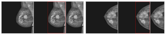By generating more distinctive training dataset images, data augmentation has enhanced the model’s diversified feature-learning capabilities []. Deep learning generalizes effectively and performs well when there is a significant amount of learned data. Random variations are introduced during each optimization iteration through data augmentation. In order to preserve the integrity of the image, this was meticulously implemented during the augmentation process. Medical imaging datasets are considerably smaller. Consequently, the dataset is multiplied by the augmentation approach. This approach mitigates overfitting as a consequence of inadequate training data []. Consequently, we implemented database training samples to facilitate augmentation. The training images were improved using a variety of image processing techniques, such as rotation (−55° to 55°, step value of 5), flipping (vertical and horizontal), scaling (15°), Gaussian noise (mean zero, 0.25 variance), and gamma-correction (gamma from 0.2 to 1.5). Training photos from the augmented dataset increased by a factor of 30 in comparison to the original images. The MIAS, DDSM, and INbreast datasets contained 9000, 35,820, and 4380 training photos, respectively, after augmentation. The augmented data from the original dataset photos are summarized in Table 4.