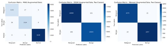 The datasets utilized in this study are publicly available. MIAS (http://peipa.essex.ac.uk/pix/mias/) (accessed on 30 September 2024), DDSM (https://www.kaggle.com/datasets/kmader/mias-mammography) (accessed on 30 September 2024), and INbreast https://www.kaggle.com/datasets/ramanathansp20/inbreast-dataset (accessed on 30 September 2024). The source code is available in the GitHub repository at https://github.com/imashoodnasir/Breast-Cancer-Classification (accessed on 30 September 2024).