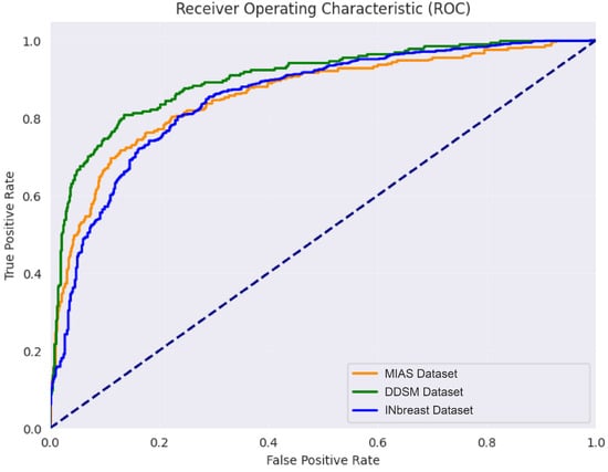 Table 12 compares pre-trained CNN models and the proposed model before and after feature optimization using GWO and mGWO on the MIAS, DDSM, and INbreast datasets. Features optimization improves classification performance, with the proposed model having the highest accuracy across all datasets after mGWO optimization. GWO improves VGG19, ResNet50, and EfficientNet-B4 accuracy on the MIAS dataset from 85.13% to 89.64%, 86.60% to 90.24%, and 90.26% to 93.79%. After optimization, the proposed model’s accuracy rises to 93.92% with GWO and 97.74% with mGWO, surpassing all previous models. In the DDSM dataset, VGG19, ResNet50, and EfficientNet-B4 improve moderately after GWO and mGWO, but the proposed model reaches 99.37% after mGWO optimization, up from 91.78% without optimization. The proposed model achieves 99.02% after mGWO in the INbreast dataset, up from 90.51% before optimization. All datasets show that mGWO improves classification accuracy more than traditional GWO. The validation accuracy and loss of propsoed model is shown in Figure 9, whereas the receiver operating characteristic (ROC) curves of all three datasets for proposed model are shown in Figure 10.
