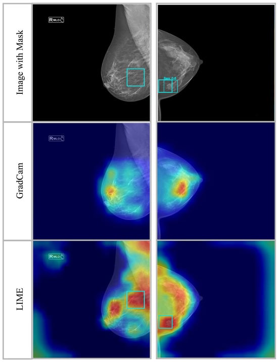 Figure 11 shows how well Grad-CAM and LIME, two popular explainability methods, extract and optimize the proposed model’s features. The first row (Image with Mask) shows the original mammographic pictures with bounding boxes emphasizing ground truth lesion spots. The categorization technique identified these sites as potentially cancerous or suspicious. The model’s feature activation zones are visualized using Gradient-weighted Class Activation Mapping in the second row. This method reveals the model’s spatial importance by highlighting the categorization decision’s most important locations. Warm colors (yellow and red) over lesion sites suggest that the 32-layer CNN model, improved with mGWO for feature optimization, correctly concentrates on key mammographic regions, exhibiting its good localization capabilities. Third row (LIME visualization) validates model interpretability and feature importance with Local Interpretable Model-Agnostic Explanations (LIMEs). A LIME generates local explanations by perturbing input pixels and detecting classification effects, unlike Grad-CAM, which provides global feature importance. LIME maps show red and orange regions, confirming that the model effectively identifies vital areas while minimizing irrelevant feature extraction. This shows that mGWO feature selection reduces redundancy and improves discriminative feature learning.