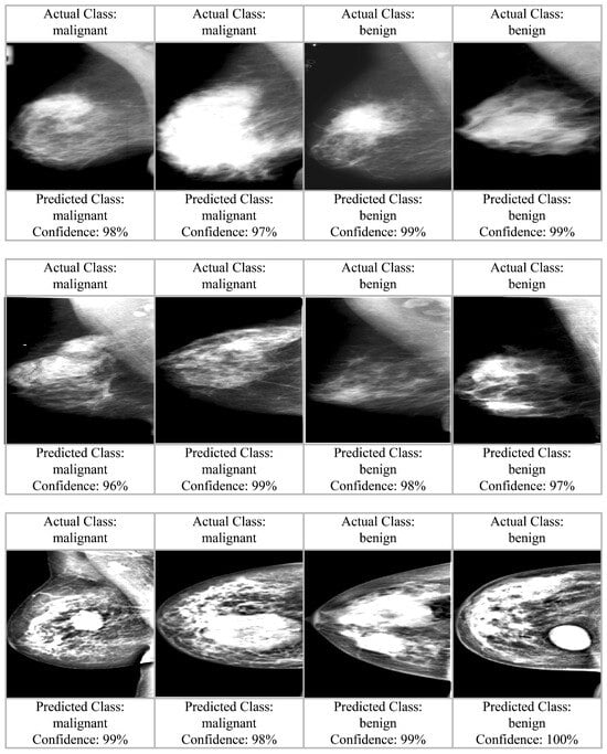 Table 14 compares state-of-the-art approaches to the proposed model on MIAS, DDSM, and INbreast datasets. The results show that the proposed model outperforms existing classification methods in most circumstances. The proposed model outperforms the five-layer CNN model with 96.55% and breast region extraction with super-resolution enhancement with 97.14% on the MIAS dataset. Although CapsNet with adaptive fuzzy filtering comes close to 98.50%, the proposed model performs better. The proposed model outperforms YOLO with InceptionResNet-V2 at 99.17% and a stacked ensemble of ResNet models with XGBoost at 95.13% in the DDSM dataset with 99.37% accuracy. ROI-based patch segmentation and two-view CNN-RNN models with ResNet and GRU reach 94.70%; however, the proposed model is higher. It outperforms EfficientNet-B4 with contrast enhancement at 98.45% and YOLO with InceptionResNet-V2 at 97.27% on the INbreast dataset with 99.02% accuracy. The stacked ensemble of ResNet models with XGBoost reaches 99.20%, slightly higher than the proposed model but not significantly. Faster R-CNN performs well with 99.00%, suggesting excellent INbreast dataset competitiveness. The proposed model performs well on all three datasets, making it one of the most accurate and reliable deep learning mammographic image classification methods. High classification accuracy, feature optimization, and image augmentation boost its performance over state-of-the-art models. The output labels of proposed model are shown in Figure 12.