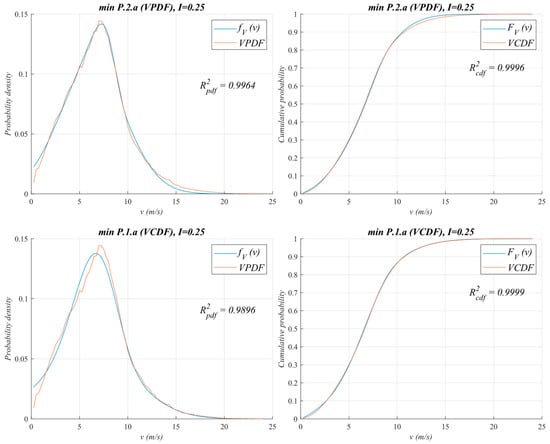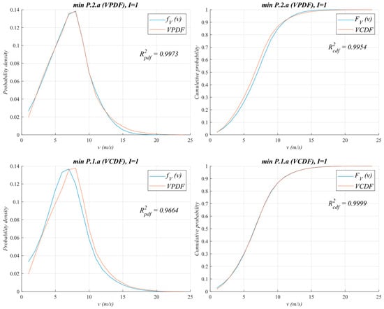 At first sight, in both cases, it can be seen that fitting directly the parameters of the probability density function (P.2.a) gives better results for R2pdf than fitting the parameters using the cumulative distribution function (P.1.a). Conversely, the best results for R2cdf are obtained when (P.1.a) is used instead of (P.2.a), except for WF2 and I = 0.25 m/s, marked in red in Table 2.
