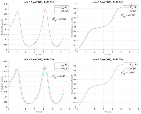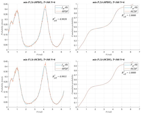 Figure 3 and Figure 4 show as examples the settings obtained for fΘ(θ) and FΘ(θ) and their corresponding frequencies of empirical wind direction data (θPDF and θCDF) for the wind farm WF1 using T = 36 and N = 6 (Figure 3) and T = 360 and N = 6 (Figure 4) to solve P.2.b or P.1.b, whose numerical results are showed in Table A5.