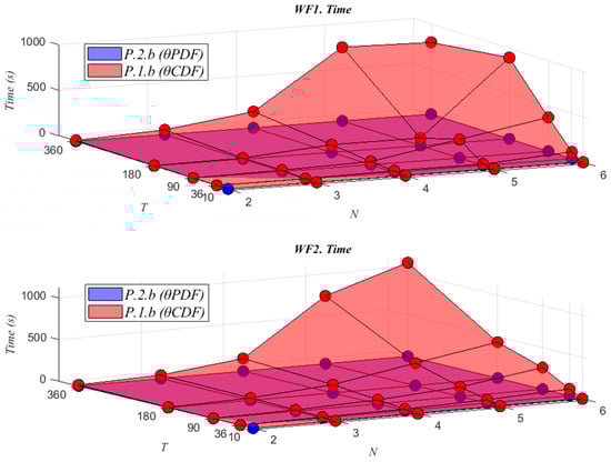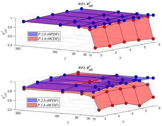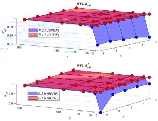 Figure 5, Figure 6 and Figure 7 show the graphical representation of the values of R2pdf, R2cdf and the time taken to fit the parameters as a function of the different values of N and T. In the case of R2pdf, Figure 5 shows that a better result is obtained for this indicator when the parameters of the probability density function have been directly fitted (P.2.b). There are some exceptions, such as in WF2 (T = 360, N = 6, min P2.b R2pdf = 0.960, min P.1.b R2pdf = 0.9950), as can be seen in Table A10. In the case of R2cdf, a better result for this indicator is obtained in all cases when the parameters of the cumulative probability function are fitted (P.1.b), as shown in Figure 6.