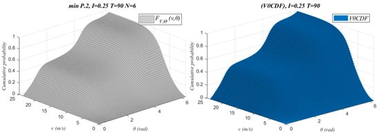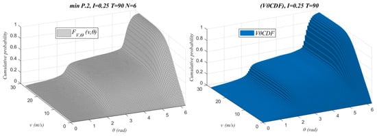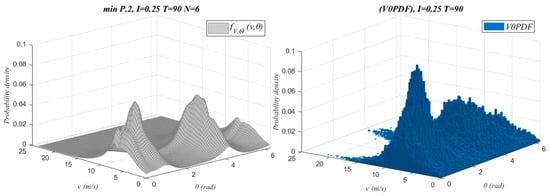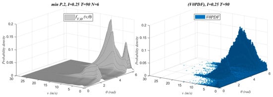 Finally, by combining the results of Section 5.1, Section 5.2, and Section 5.3 in Equation (1), we obtain fV,Θ(v,θ), and we can evaluate the estimator R2pdf between the analytical expression obtained and the empirical data of wind speed and wind direction (VθPDF). As can be seen in Table 3 and Table 4, the best fit for fV,Θ(v,θ) (R2pdf) is obtained when the parameters of the probability density functions fV(v), fΘ(θ), and g(ζ) have been directly estimated (P.2).