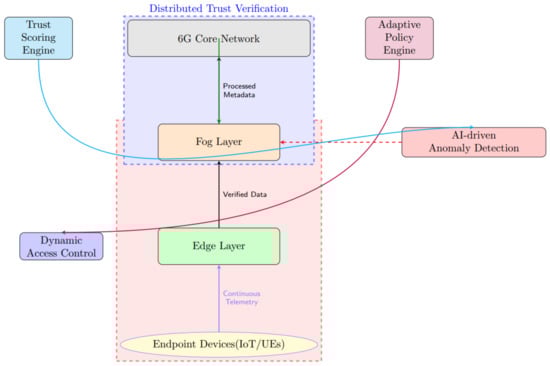 In the context of 6G networks, their ultra-low latency, high reliability, and connectivity of a massive number of devices are key, and, hence, robust security mechanisms are needed. They can be integrated into 6G networks with distributed edge and fog computing environments, where these challenges can be solved by using the scalable, adaptive solution of Zero-Trust principles [33,34,35,36]. Zero-Trust can be enabled with the usage of cutting-edge technologies like AI-powered anomaly detection, identity management on a blockchain, and dynamic access control policies to verify all the network entities continually. We introduce ZTF-6G, a Zero-Trust-based solution that can be used to deploy Zero-Trust and security to the distributed edge and fog computing in 6G networks; it is also capable of addressing their limitations and aligning with the next-generation system requirements [37,38,39,40].