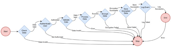 The structured process of secure data handling—starting with an initial data validation—is illustrated in the flowchart shown in Figure 2. User authentication is carried out if the data are valid. Subsequent data processing occurs only after successful authentication and validation by the system. The next step is data encryption; upon success, the encrypted data are securely stored. Once the encrypted data are stored, system integrity is maintained by logging the event. If an error occurs at any stage—such as invalid data, unauthorized access, encryption failure, or logging failure—the process is terminated to ensure security and prevent inconsistencies. The UML flowchart below clearly outlines the decision points and possible outcomes, providing a comprehensive model for the secure and systematic handling of data.