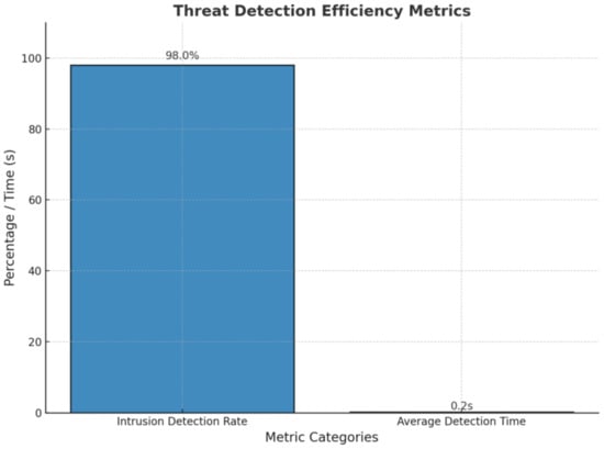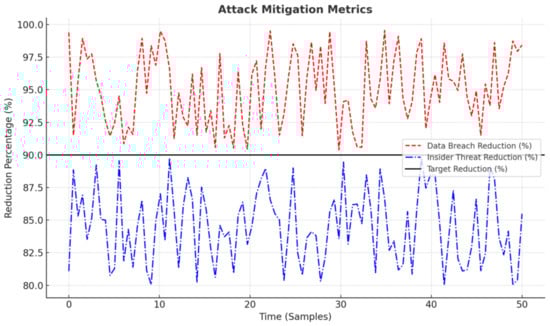 where represents the number of data breaches in traditional models, and denotes the number of breaches in the proposed model. The insider threat reduction rate () is calculated as follows: