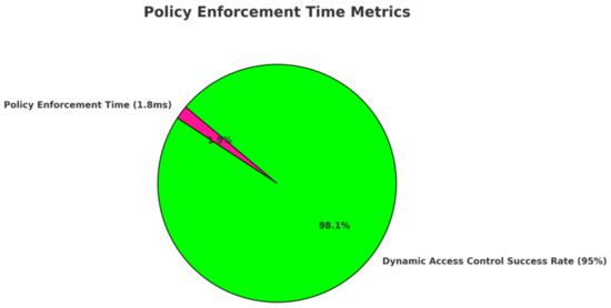 In 6G networks, dynamic security management needs to be performed at a fast speed; hence, policy enforcement time should be taken into account as a critical metric. The proposed model has an average of 1.8 ms policy enforcement time and 95 percent dynamic access control success and is presented in Figure 16 and Table 19. Thus, the policy enforcement time () is computed as follows: