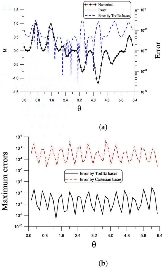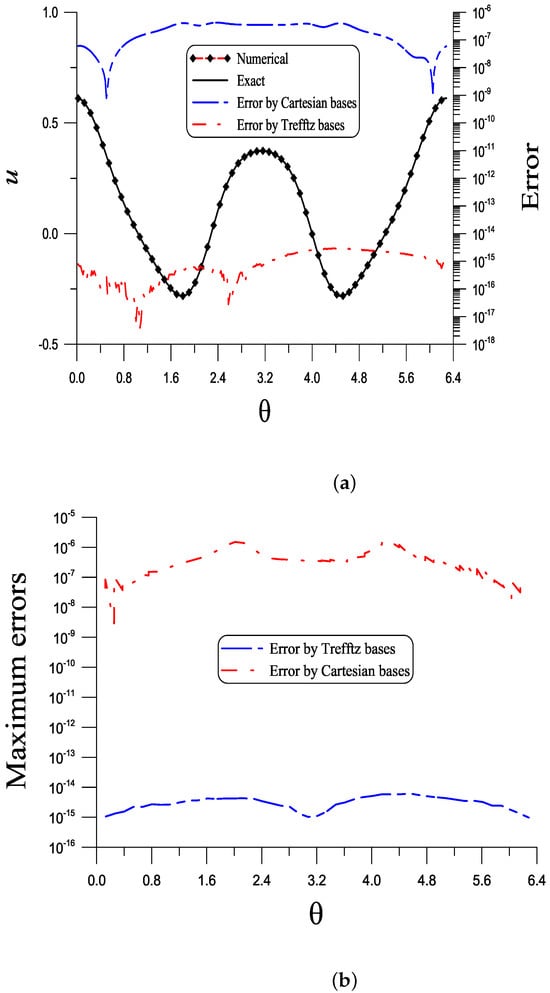 We impose the Dirichlet boundary condition for this problem, where collocated points are used to satisfy the boundary condition. By using the Cartesian bases in Equation (42), we take and with unknown coefficients. The resulting linear system is scaled by , such that all the column norms of the coefficient matrix of the linear system are equal to [29]. The dimension of the coefficient matrix is , and we apply the conjugate gradient method (CGM) to solve the resulting normal system with a convergence criterion . We test the accuracy at 2500 points in the domain. It does not converge within 10,000 steps and the maximum error (ME) in the entire domain is ME = and the root-mean-square error (RMSE) is RMSE = . The numerical and exact solutions are compared on the curve of , on which the maximum error is , as shown in Figure 2a by a dashed–dotted line.