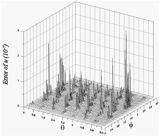 Under Equation (107) with and and unknown coefficients, the Trefftz-type basis is convergent with 9 steps, and ME = and RMSE = are obtained. The local error on the above curve and the maximum error in the entire domain are shown in Figure 2a,b. It can be seen that the Trefftz-type basis is convergent fast and very accurate. Figure 3 plots the error of numerical solution using the Trefftz bases over the plane . It can be seen that the absolute error of u in the entire domain is of the order .