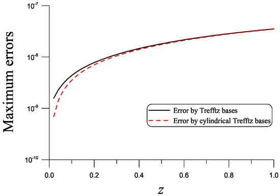 Numerical errors of the 3D Laplace equation of Example 3 are compared using the cylindrical Trefftz bases and the Trefftz bases.
