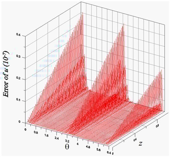 We impose the Dirichlet boundary condition for this problem, where collocated points are used to satisfy the boundary condition. Under Equation (112) with and , unknown coefficients, and , ME = and RMSE = are obtained, as shown in Figure 6 by a solid line. Under Equation (107) with and , unknown coefficients, and , ME = and RMSE = are obtained, as shown in Figure 6 by a dashed line. Both the efficiency and accuracy of the Trefftz-type basis and the cylindrical Trefftz-type basis are better than that in [18]. Figure 7 plots the error of numerical solution using the Trefftz bases over the plane .