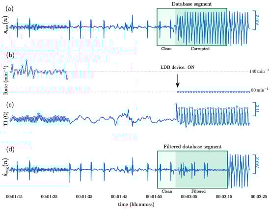 A 70  interval from an OHCA episode. From top to bottom: (a) ECG, (b) instantaneous CC rate, (c) thoracic impedance (TI), and (d) filtered ECG (only filtered in the interval corresponding to mechanical CCs in the database segment). CC instants are depicted as blue circles in the TI signal. Activity shows manual CPR (first 15 ), followed by a pause for the LDB device application, and then a resumption of mechanical CPR (last 20 ). The interval highlighted in green in Panel (a) corresponds to a 22 s segment included in the study dataset. The first 6 s (light green), free of CC artifacts, were used to annotate the ground truth rhythm (organized) of the patient, while the last 16 s with artifact (dark green) were used to develop the algorithms.