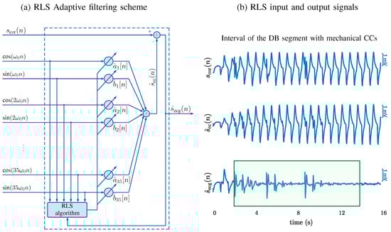where the gain matrix, , and the coefficient vector were initialized to  and . As shown in the previous equations, there are two configurable parameters in the RLS filter: the number of harmonics, N, that model the artifact, and the forgetting factor, , which provides a trade-off between the filter’s adaptability and stability. These values were fixed to  and , based on the optimal RLS configuration identified in [], where the RLS filter was evaluated in terms of the performance of a Sh/NSh decision algorithm applied to the filtered signal. Panel (a) of Figure 2 shows the adaptive RLS filtering schema, while Panel (b) displays the input and output signals. From top to bottom, we have shown the following: the corrupted ECG, ; the estimated CC artifact, ; and the filtered ECG revealing the underlying rhythm of the patient (which, in this case, corresponds to an OR rhythm).