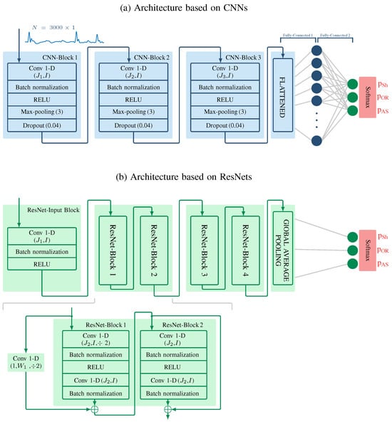 Architecture of (a) CNN-based and (b) ResNet-based rhythm classifiers. Panel (a) was extracted from [].