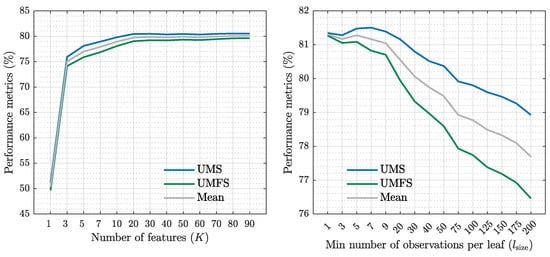 The cross-validation performance metrics (UMFS, UMS, and the average between UMFS and UMS) for the classic machine learning algorithm as a function of the number of features K (left panel) and the minimum number of observations per leaf  (right panel). The right panel corresponds to .