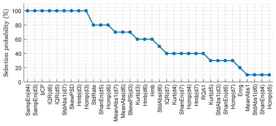 Selection probability for the 30 most selected features by the RF classifier in the 10 iterations of the 10-fold CV loop.