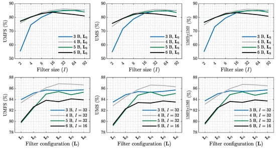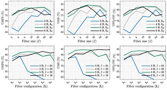 Figure 7 analyzes the effect of changing the parameters of the ResNet architecture. Similar to CNNs, the filter width was optimized first with the filter configuration fixed at  (first row) for fixed optimal filter sizes, and this was then followed by the selection of filter configuration (second row). The best classification results were obtained for four blocks. Adding a fifth block increased the complexity of the network (number of trainable parameters) and slightly decreased performance. Using only three blocks resulted in a large decrease in performance, or an overly simplistic model. As the third column of the first row shows, the best performance in terms of the average between UMFS and UMS was obtained for  when  and  when . With the filter width fixed, the second row of Figure 7 shows that the best performance was achieved for four blocks and the  filter configuration. Thus, the optimal configuration of the ResNet architecture consisted of four blocks containing 6, 12, 24, and 48 filters, respectively, all of them of width 32, that is, the ResNet input block used four filters and the remaining three blocks used 12, 24, and 48 filters in each of the residual blocks. In the training set, this configuration obtained a UMFS and UMS of 86.9% and 86.6%, respectively. In the entire testing set, the ResNet model obtained a value of 88.3% for both the UMFS and the UMS. The mean (SD) of the performance metrics obtained using the 20 replicas of the testing set can be found in Table 3.