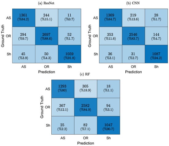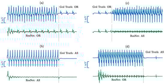 Figure 8 shows the confusion matrices obtained for the optimal configuration of the three models using the entire testing set, where 5816 segments were obtained from 880 patients. The distinction between AS and OR proved to be the most challenging. Regarding the ResNet, 15.1% of AS were incorrectly classified as OR, whereas 9.7% of OR rhythms were misclassified as AS. These findings are in line with those reported by Kwok et al., where, on a limited set of patients, they demonstrated the first three-class rhythm classification algorithm during manual CPR []. In scenarios without a CPR artifact, the AS/OR discrimination is relatively simple and can be addressed using energy and heart rate measurements. During CCs, spiky filtering residuals may be confounded as QRS complexes during AS (Panel (d) of Figure 9). Conversely, CPR artifact filtering may reduce R-peak amplitudes in OR rhythms, producing erroneous AS classifications (Panel (c) of Figure 9).