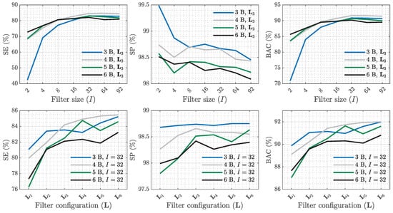 Given the importance of the Sh/NSh discrimination during resuscitation therapy and as an additional experiment, the best performing method (ResNet) was adapted for the binary Sh/NSh classification task. For this experiment, AS and OR rhythms were grouped into the NSh category using 9666 segments (1252 Sh and 8414 NSh) to train and 5813 segments (1154 Sh and 4659 NSh) to test the model. The optimal ResNet architecture for this problem was selected in an analogous manner to that for the three-class problem. Performance was evaluated in terms of sensitivity (SE, the proportion of correctly classified Sh rhythms) and specificity (SP, the proportion of correctly classified NSh rhythms) in line with the minimum performance requirements for the Sh/Nsh discrimination recommended by the AHA; balanced accuracy (the mean of SE and SP) was chosen as a summarizing metric. Figure 10 shows the performance metrics obtained across the 10-fold CV loop in the training set. As in previous figures, the top row contains analyses of the impact of altering the width of the filters, I, while the bottom one includes details of the impact of altering the configuration of the filters, , for a fixed filter size. As shown in the third panel of the bottom row, the  configuration with three and four blocks and  achieved the maximum BAC, with the four-block one being slightly higher. This architecture obtained SE/SP/BAC scores of 85.5%/98.6%/92.0% and 90.6%/98.5%/94.6% in the training and testing sets, respectively.