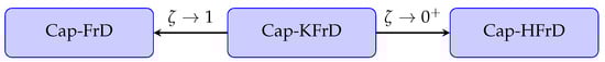 A schematic representation of the limiting behavior of the Cap-KFrD as the parameter approaches 1 and , recovering the Cap-FrD and Cap-HFrD fractional derivatives, respectively.
